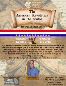 The American Revolution is often told through familiar stories but the reality in the South was far more complex. Join us as we welcome Dr. Adam Tate of Clayton State University for an engaging talk that explores the myths, overlooked events, and diverse perspectives that shaped the Revolutionary War in our region. Discover how the Revolution truly unfolded in the South and how it continues to shape our understanding of history today.