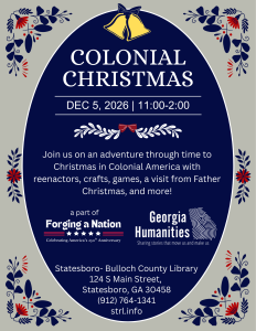 Join us on an adventure through time to Christmas in Colonial America with reenactors, crafts, games, a visit from Father Christmas, and more!